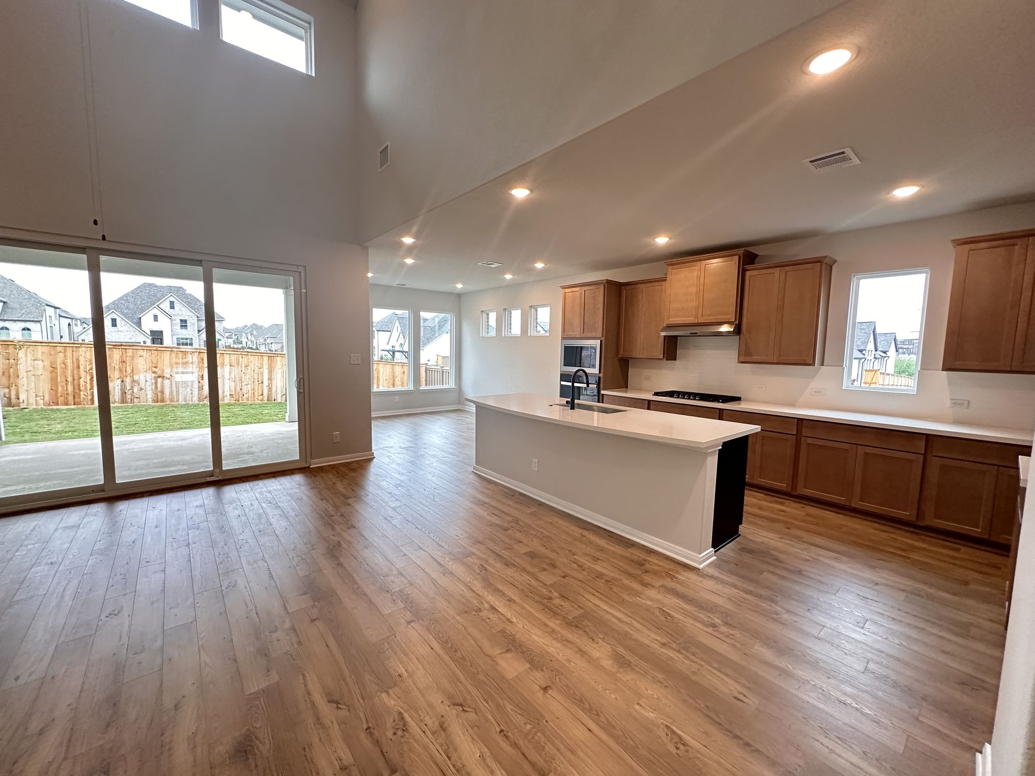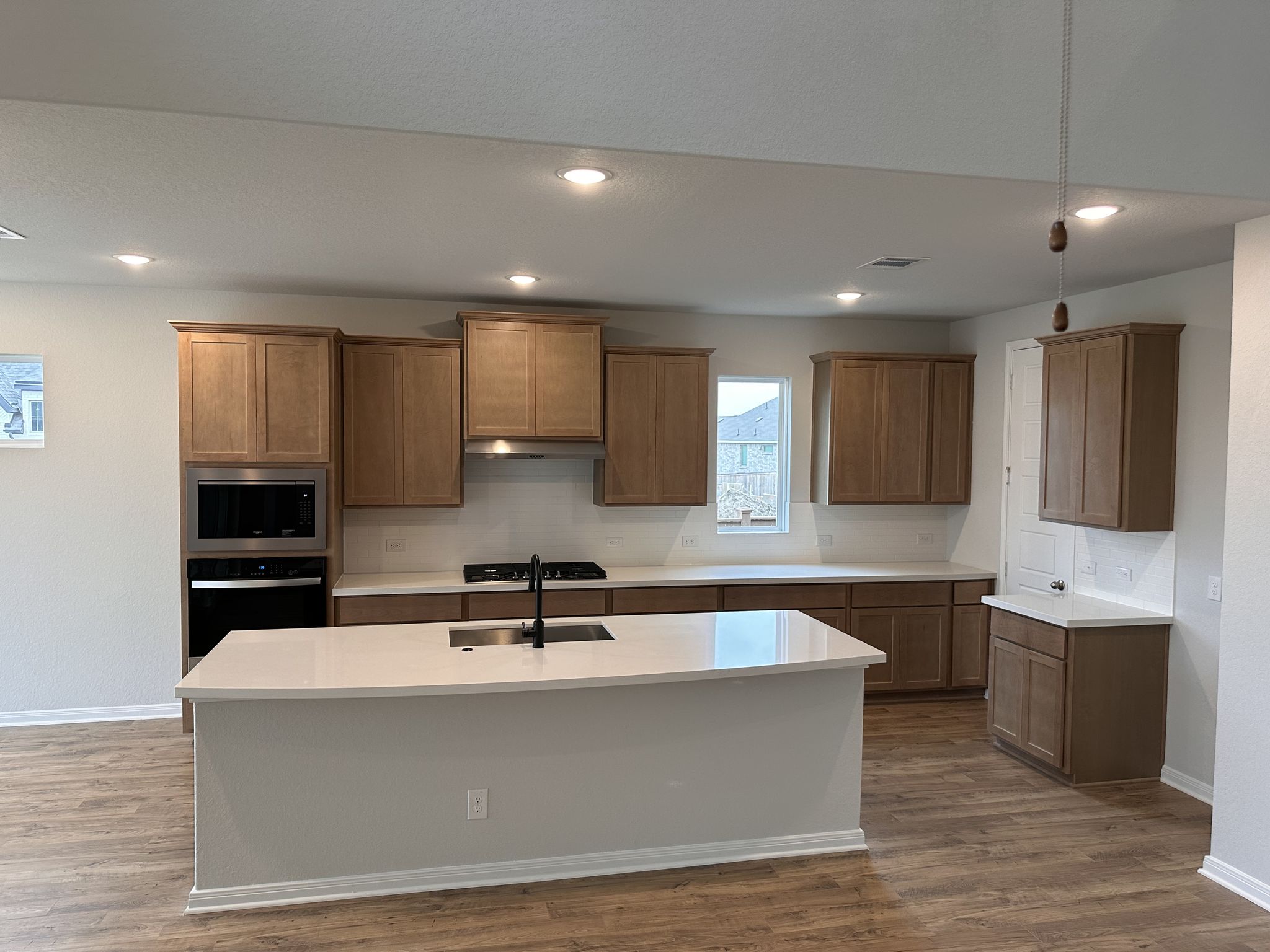 The main level centers around an open kitchen, dining, and family room so everyone can stay connected—whether you’re cooking, watching the game, or helping with homework. A large island, gas cooktop, built-in oven and microwave, walk-in pantry, and plenty of cabinet space make this kitchen a true command center. A dedicated study at the front of the home is ideal for working from home or managing household business, while a secondary bedroom and full bath downstairs offer flexibility for guests or multigenerational living.
